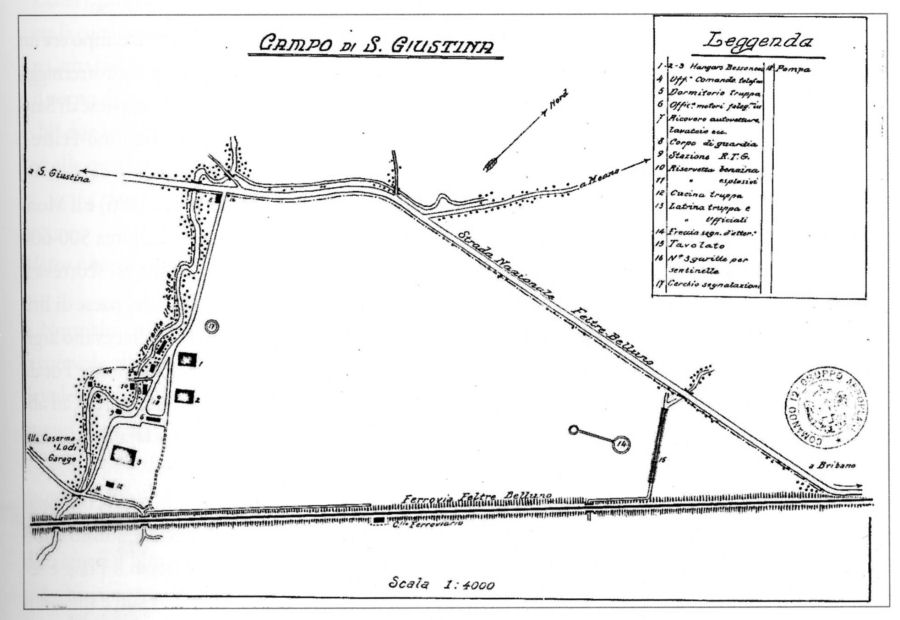 Nel giugno del 1917 entrò in funzione il campo di Santa Giustina Bellunese nella parte più ampia della valle del Piave, a nord-est del paese a circa 1200 metri dal centro dell'abitato, fra la strada nazionale Belluno-Feltre e la riva destra del Piave. Ad est era fiancheggiato dalla ferrovia. Di forma triangolare con i lati di 800 metri lungo la ferrovia, 850 lungo la strada nazionale e 450 lungo il torrente Umasna. Era dotato di tre hangar tipo Bessenau e due baracche tipo Zeller, sei costruzioni in legno e due baracche come riservette.